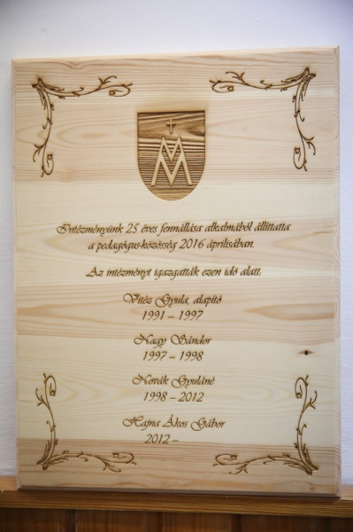 Az intézmény története 25 évét kiállításban dokumentálta, és az iskola falán emléktáblát helyeztek el az épületben, amit Snell György, az Esztergom-Budapesti Főegyházmegye segédpüspöke áldott meg. „Ősidők óta fontos az ember számára életének megörökítése. A múlt jelzésszerű megjelenítése tartja meg az emberek emlékezetében az ősök számára fontos eseményeket. Ennek szellemében helyezzük el most is az emléktáblát. Bár 25 év mindössze egy pont az emberiség történetében, de egy intézmény életében a hőskor. A jubileumot ünnepelve meg kell állni, hálát adni Istennek a 25 évért – ennek szellemében kérem Isten áldását az intézmény és a benne dolgozók életére. Imádkozzunk a mustármagból fává növekedett iskola további kibontakozásáért” – buzdított Snell György.