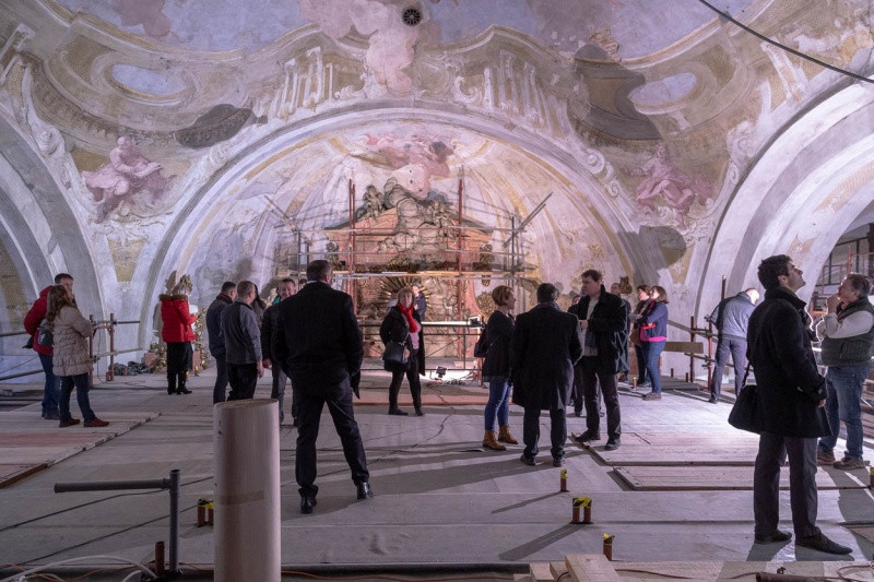 Jeszeniczky Ildikó Munkácsy-díjas festő-restaurátorművész a nagyszerű egyházművészeti értékeket képviselő falképek restaurálásának folyamatát mutatta be vetítéssel. Mint elmondta, a tervezett ütemezés szerint halad a székesegyház felújítása, és hamarosan befejeződik a freskók feltárása és tisztítása. A restaurátorművész ismertette az eddigi látványos eredményeket, majd a templomtérben felépített hatalmas állványzatról a látogatók közelről is megtekinthették a szentély feltárt mennyezetképét és a második boltszakaszban lévő freskók folyamatban lévő tisztítási munkáit. Megcsodálhatták többek között az egyházmegyéket alapító Szent István alakját; az ábrázolás szinte teljesen ép, eredeti állapotában került elő a több évszázad alatt lerakódott porréteg és átfestések alól.