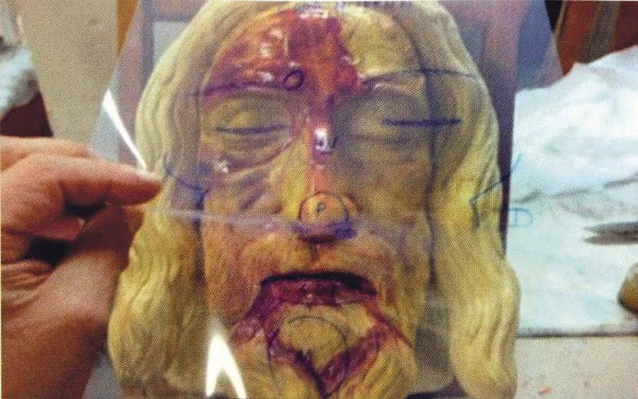 Egyes pontok jól mutatják a két textília kompatibilitását, ilyenek például a homlok területén található vérmaradványok, az orron, a jobb arccsonton és az állon látható, különböző sebekből származó nyomok.