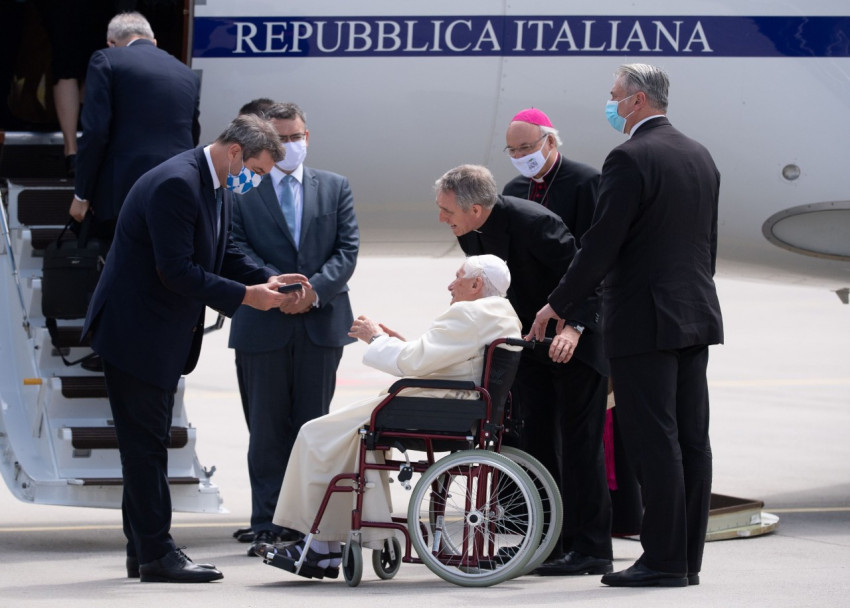 Az emeritus pápa június 22-én, hétfőn délelőtt vett búcsút a regensburgi szemináriumtól, majd autóval utazott Münchenbe, ahol kíséretével együtt repülőgépre szállt, és 13 órakor érkezett meg a római Ciampino repülőtérre. A kerekesszékben utazó XVI. Benedeket személyi titkára, Georg Gänswein érsek, egy vatikáni csendőrtiszt és egészségügyi személyzet kísérte.